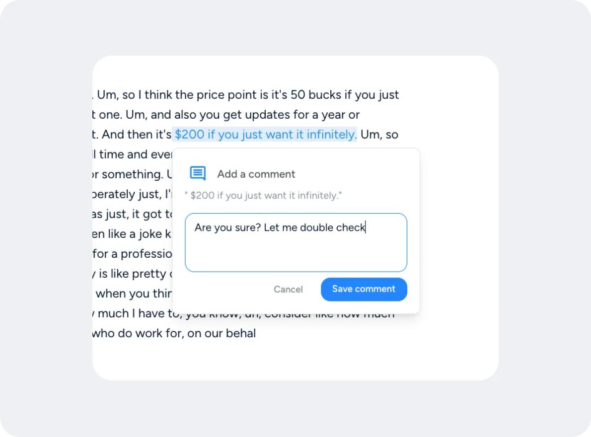 Comment on transcripts, tag teammates, and keep discussions tied to the exact moment in the audio. Your team gets one place for transcripts, summaries, and context. No more scattered notes.