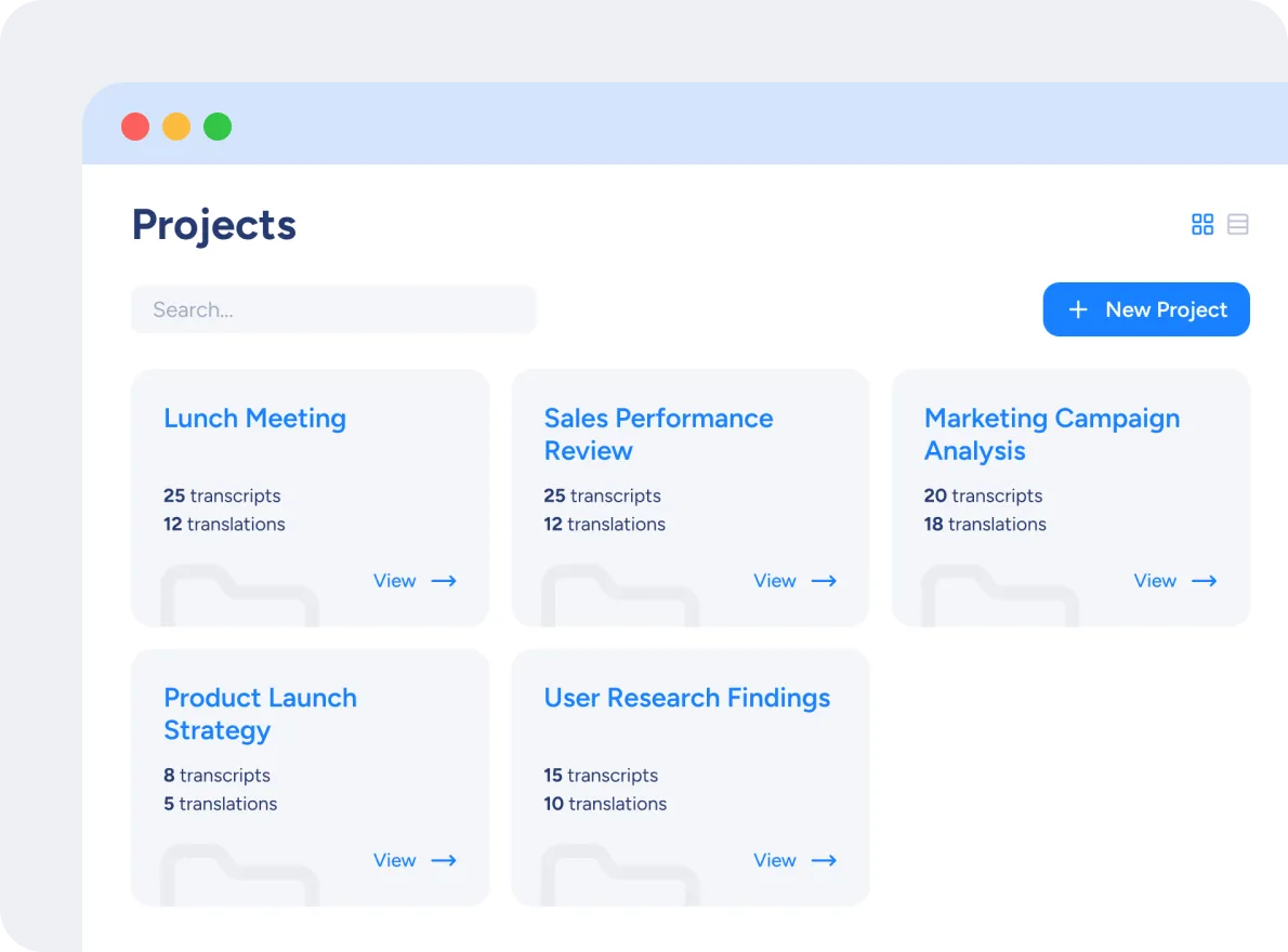 Create and manage projects to organize transcripts. Manage projects and review transcripts from any web browser.
