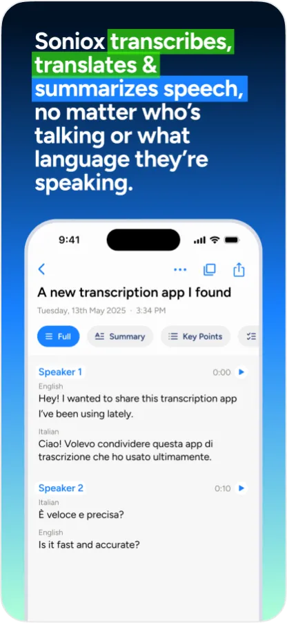 Say what you need to say in your language. No need to pause, slow down, or find the perfect word. Soniox App understands speech as it flows – multiple speakers, interruptions, fast dialogue, or switching languages mid-sentence.